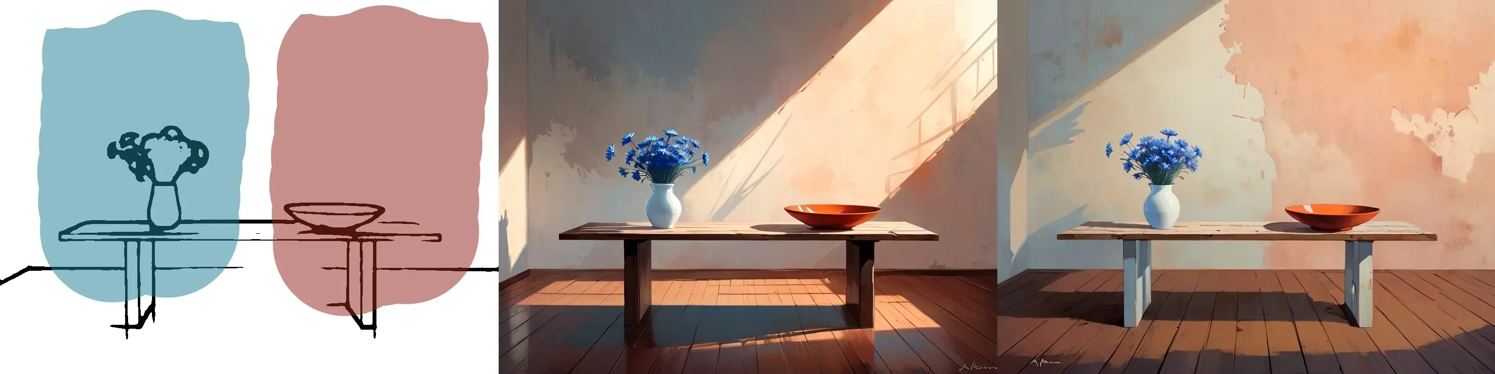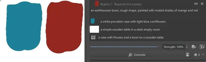 an earthenware bowl, rough shape, painted with muted shades of orange and reda white porcelain vase with light blue cornflowersa simple wooden table in a stark empty rooma vase with flowers and a bowl on a wooden tableThe prompt is split up between three regions. Specifying “on the left”, “on the right” in the text is no longer needed. Instead there is a “Root” prompt which describes the overall composition of the image without going into details.