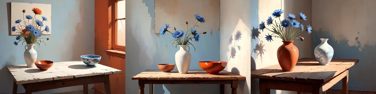 a simple wooden table in a stark empty room, on the left a white porcelain vase with light blue cornflowers, on the right an earthenware bowl, rough shape, painted with muted shades of orange and red
